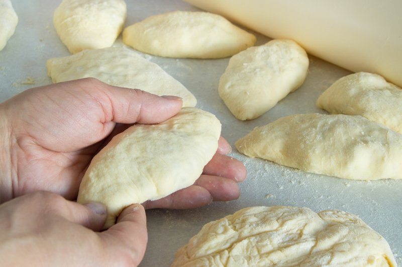 Z kulek uformuj podłużne bułeczki o grubości około 0,5 cm. Na środku każdego ciasta ułóż nadzienie delikatnie ściskając krawędzie. Poukładaj wszystkie bułeczki na blasze wyłożonej papierem do pieczenia.