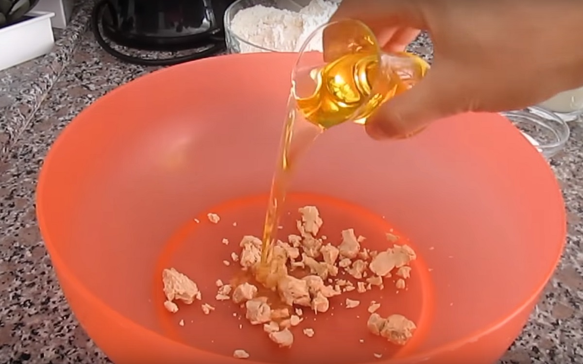 Szykujemy sobie większą miskę. Nasze drożdże kruszymy i wrzucamy do przygotowanego naczynia. Kolejno zalewamy je olejem roślinnym i dosypujemy sól oraz mleko.