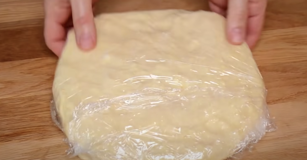W międzyczasie przygotowujemy blat posypany mąką, Po upływie 30 minut ciasto wyciągamy z folii i kładziemy na deskę,