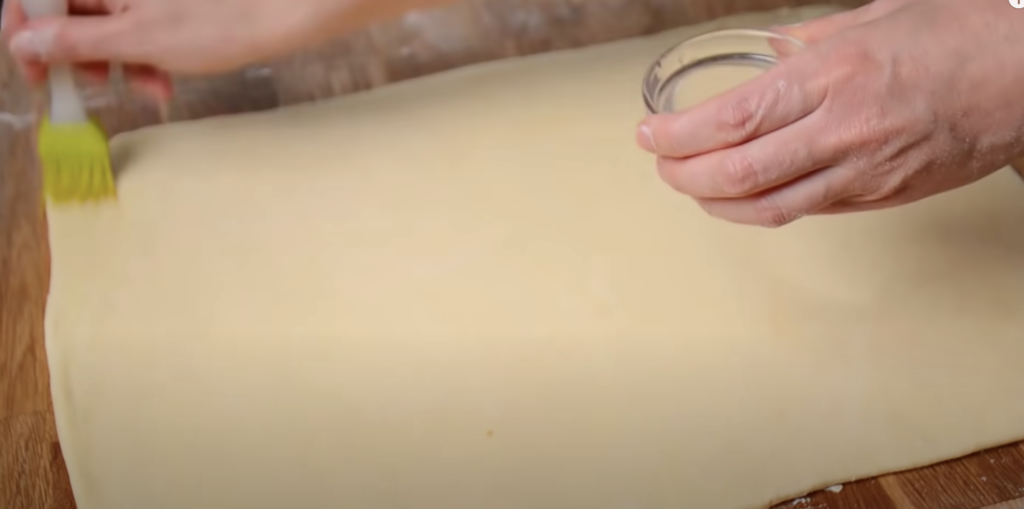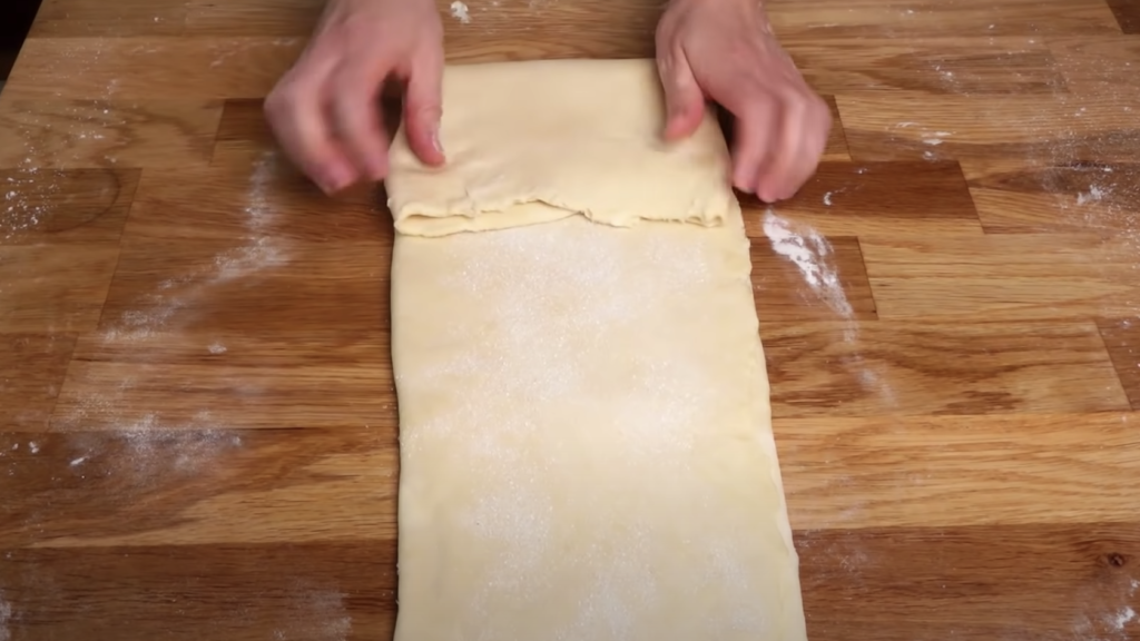 Posypujemy ciasto przygotowanym przez nas cukrem i wałkujemy, Dzielimy ciasto na pół i składamy, by znów rozwałkować,