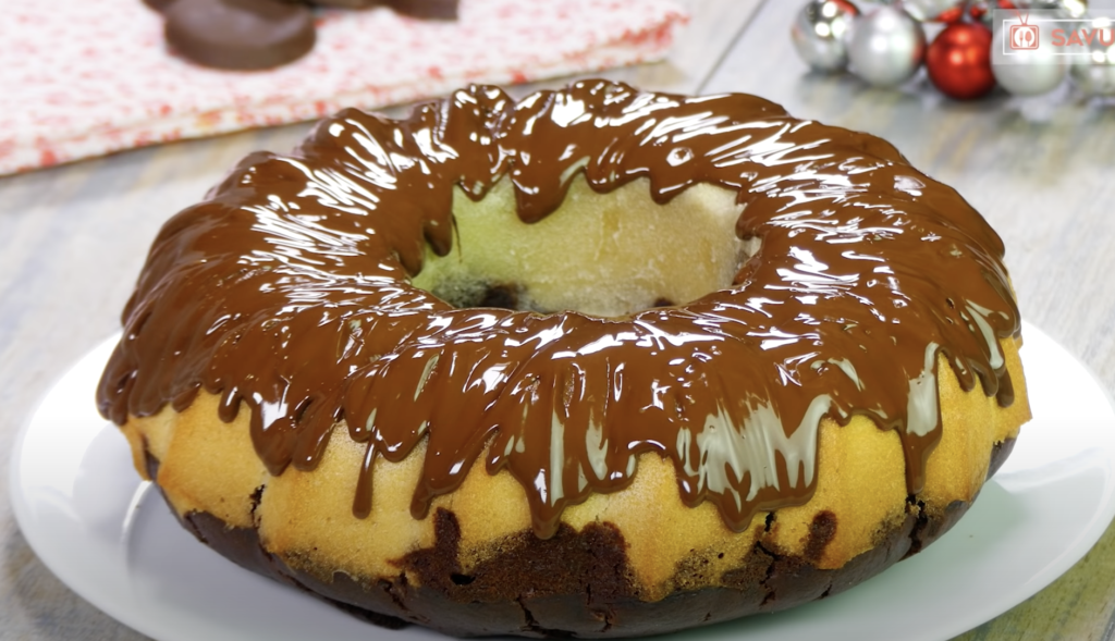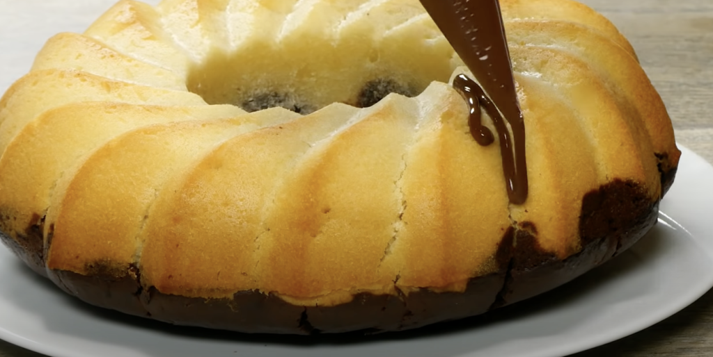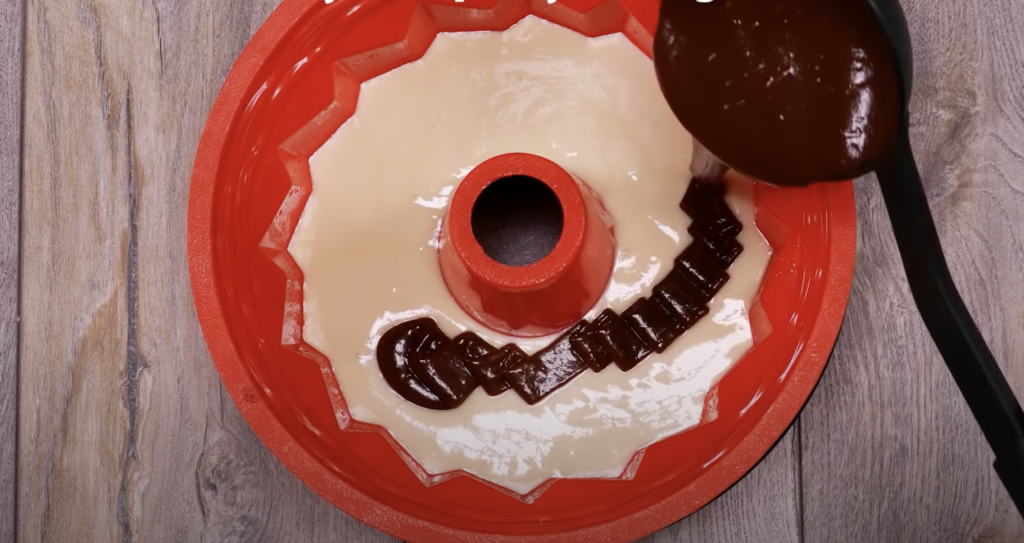 Po wszystkim, rozlej ciemną mieszankę na jasnej części ciasta.