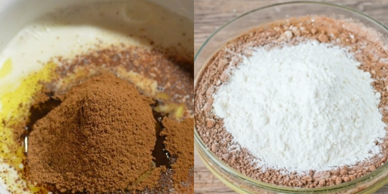 Do przyrządzonej masy wlać olej oraz dodać kakao. Całość wymieszać. Mąkę i proszek do pieczenia przesiać przez sitko i dodać do masy. Wsypać rodzynki i całość dokładnie połączyć.