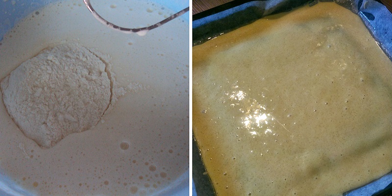Połącz mąkę ze skrobią i przesiej przez sito. Dodaj do masy i ponownie zmiksuj na niskich obrotach. Wyłóż blachę (najlepiej ok. 20 x 30 cm) papierem do pieczenia i przelej do niej ciasto. Rozgrzej piekarnik do 175 °C . Włóż ciasto i piecz przez ok. 25 minut.