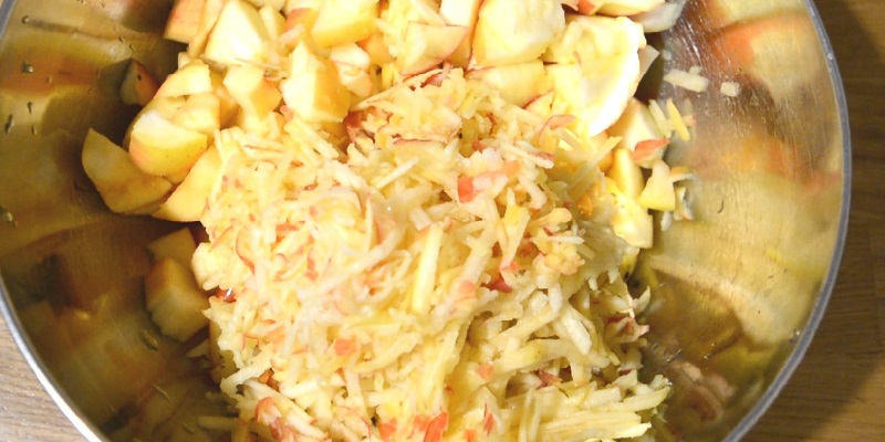 Umyj jabłka, obierz ze skórki i usuń gniazda. Zetrzyj jabłka na tarce z grubymi oczkami i przełóż do garnka. Dodaj resztę masła. Gotuj przez kilka minut na niewielkim ogniu.