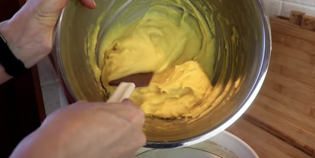 Do garnka dodaj jajka, mleko, cukier i mąkę. Przygotowane składniki zagotuj, aż masa zgęstnieje. Powstały budyń odstaw do ostygnięcia. Następnie używając miksera ubij masło i stopniowo dodawaj do niego budyń za pomocą łyżeczki.