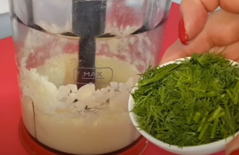 300 gramowy słoiczek należy wysterylizować. Czosnek obrać i zmiksować za pomocą blendera. Świeży koper opłukać, posiekać i dodać do czosnku.