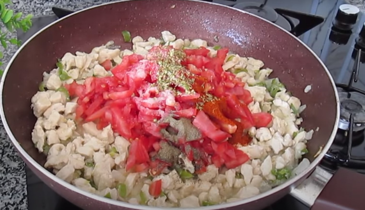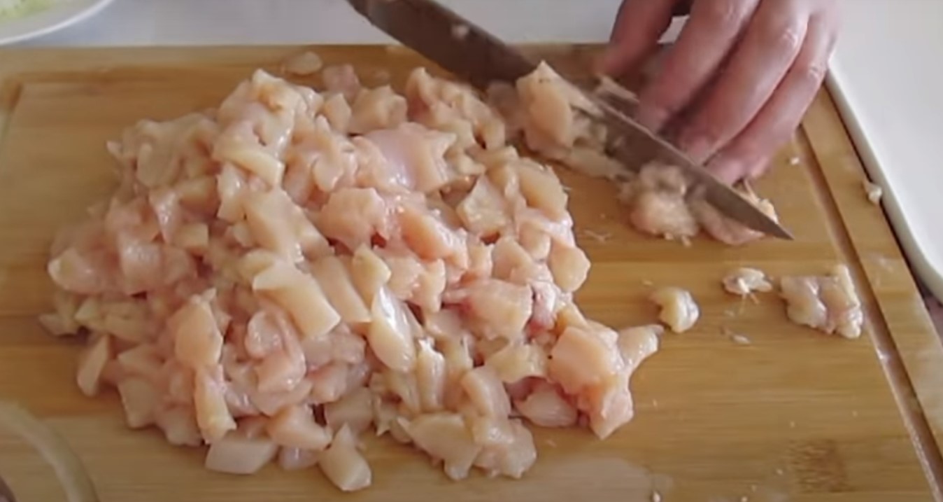 W czasie, gdy kurczak się piecze, przygotuj farsz. Posiekaj kurczaka i wszystkie warzywa, w tym pomidory, cebulę i paprykę. Na dużej patelni rozgrzej olej. Gdy papryka i cebula będą już zrumienione, dodaj na patelnię kurczaka. Ciągle mieszaj, aby się nie przypaliły. Dopraw masę solą i wszystkimi pozostałymi przyprawami.