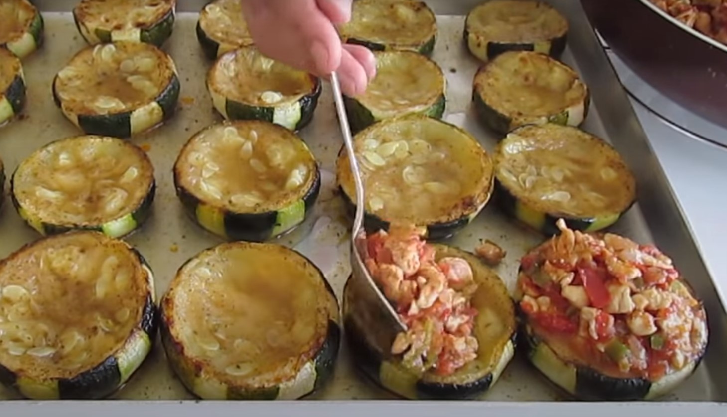 Dokładnie wymieszaj farsz i zdejmij z ognia, gdy już się zrumieni. Aby farsz lepiej przywierał, na przygotowanych upieczonych krążkach cukinii ułóż pergamin do pieczenia. Na wierzchu ułóż plasterek pomidora.