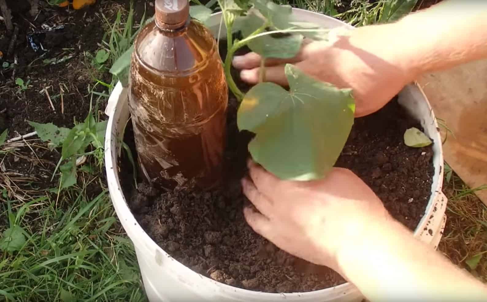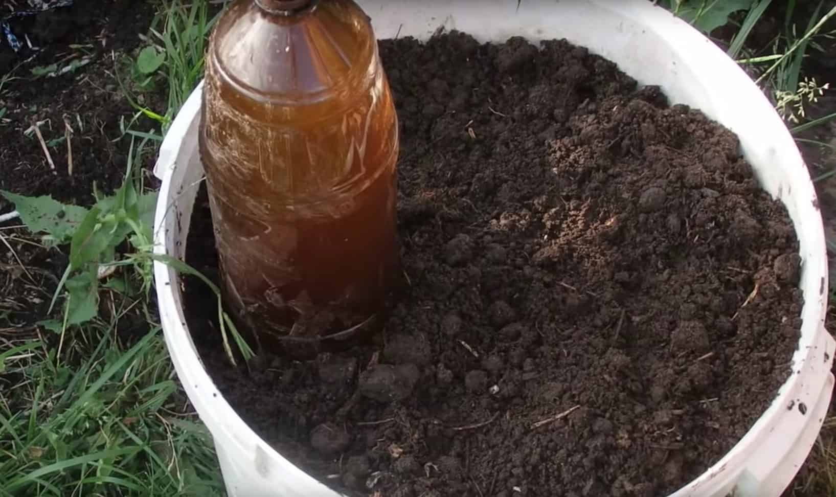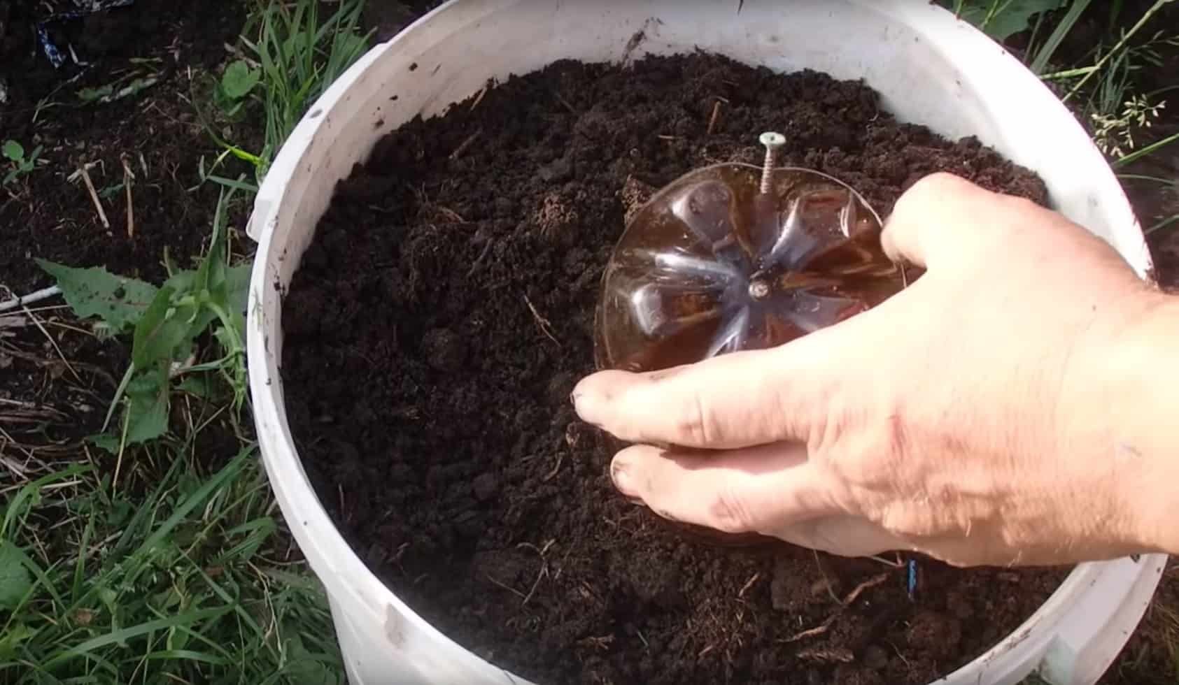 Dzięki plastikowej, dwulitrowej butelce napełnionej wodą i włożonej do góry dnem w wiaderko z ziemią. Do dna owej butelki przykręć śrubę.