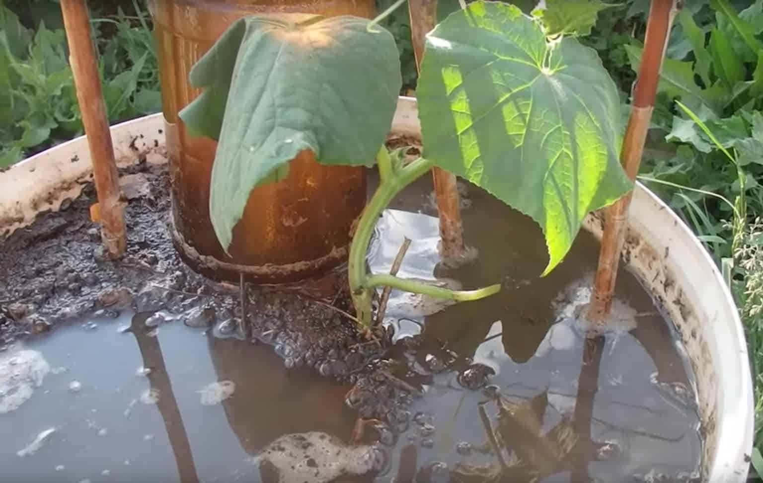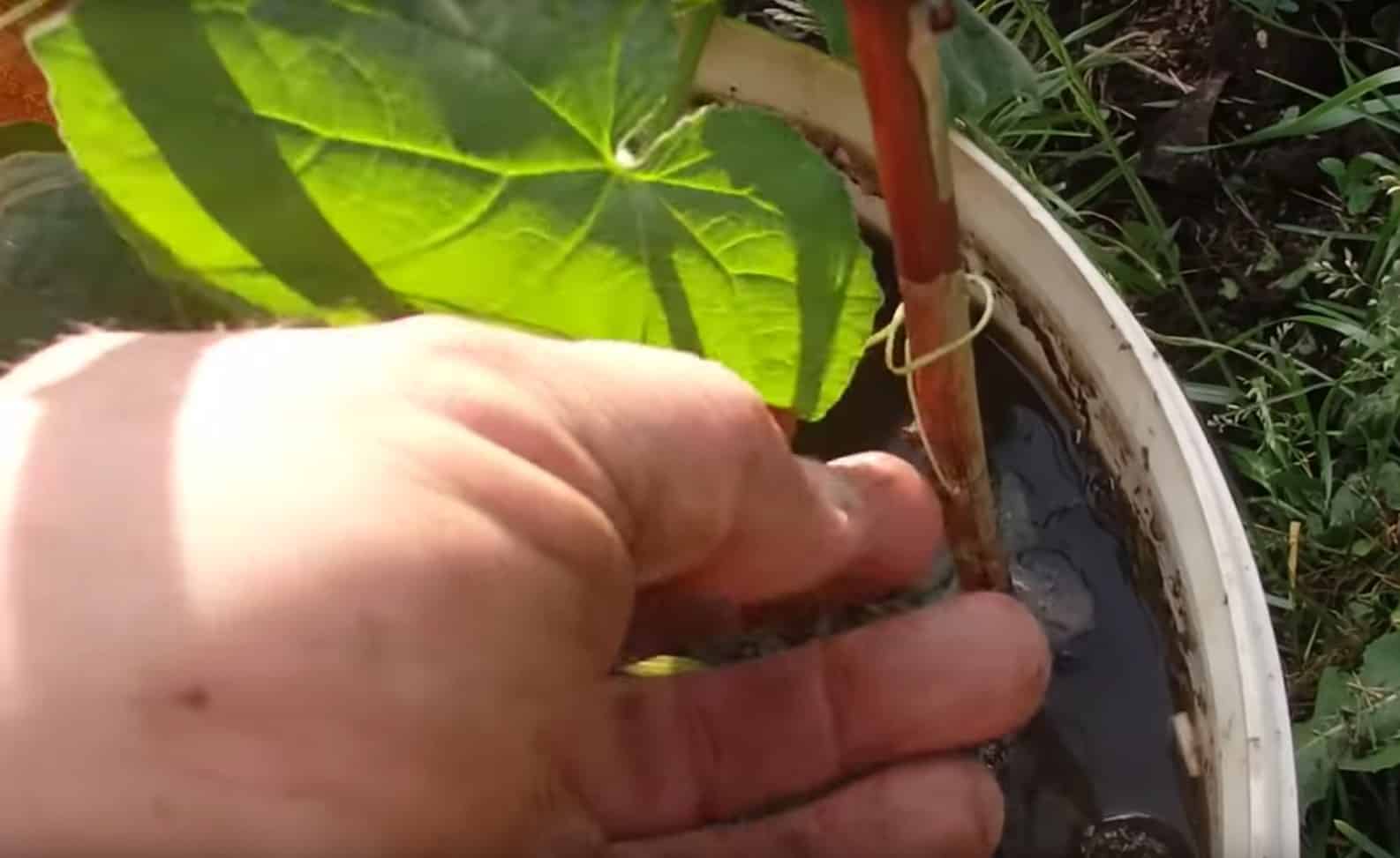 Kolejnym krokiem w pięlęgnacji naszej rośliny będzie owinięcie wąsów sadzonki wokół właśnie tych patyków. Dla dobra naszego warzywa po wsiąknięciu dwóch warstw wody, podsyp jej jeszcze trochę ziemi tak, aby wyrównała się z wysokością wiadra.