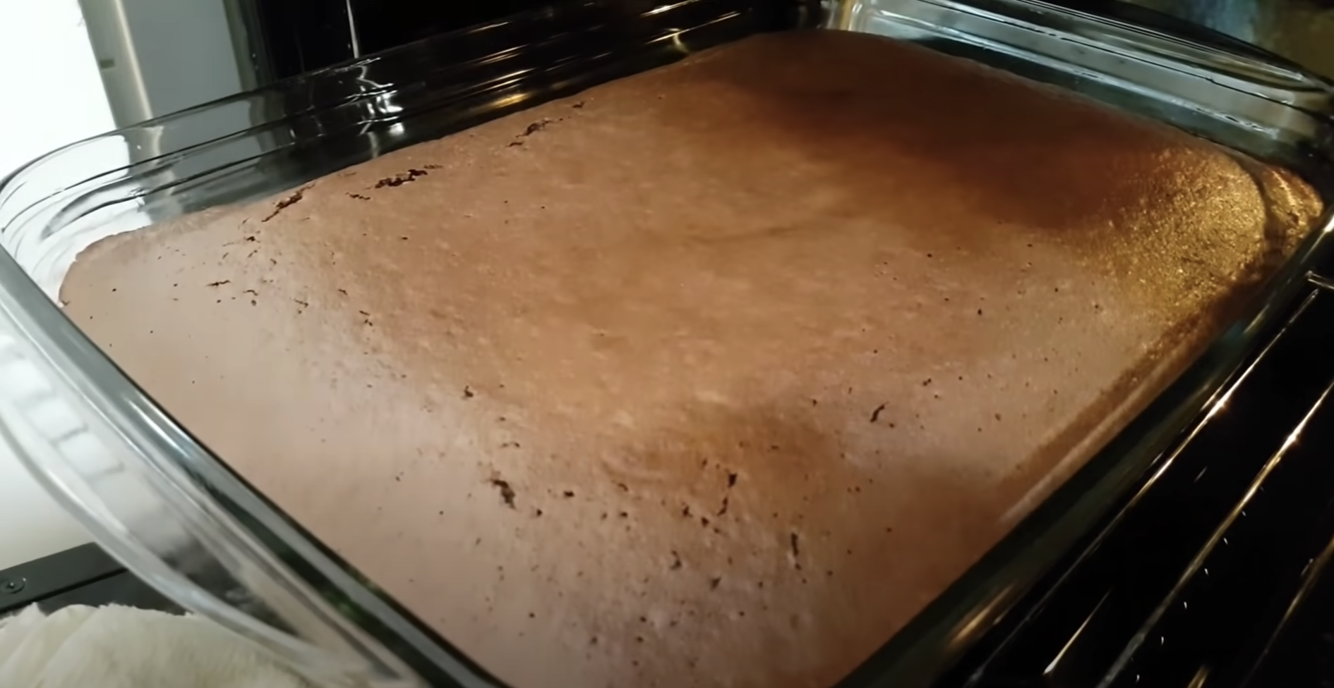 Przygotowaną masę wylewamy do formy o wymiarach 30×40 cm. Uwaga! Pamiętaj, aby blaszkę do pieczenia posmarować wcześniej olejem, lub masłem! Pomoże to uniknąć przypalenia ciasta od spodu, a także pomoże w jego lepszym upieczeniu.