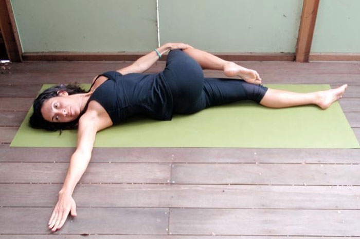 Połóż się na plecach na twardej powierzchni. Ręce rozłóż prostopadle do ciała. Prawe kolano unieś pod kątem 90 stopni. Lewą ręką odciągnij je w bok, na lewą stronę. Głowę i tułw skręć w prawą stronę. Nie odrywaj ramion od podłoża. Wytrzymaj w tej pozycji około 30 sekund. Powoli wróć do pozycji wyjściowej. Powtórz czynność z drugą nogą.