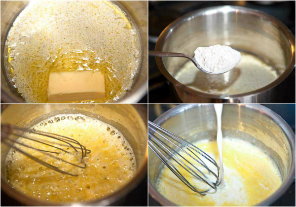 W czasie, kiedy ziemniaki będą się gotowały, można przygotować sos. Do rozpuszczonego w rondlu masła – nie ściągamy go z ognia – dodajemy mąkę i energicznie mieszamy, aby powstała jednolita masa. Dolewamy mleko, nadal mieszając i doprawiamy solą. Beszamel doprowadzamy do wrzenia, po czym zdejmujemy z ognia.