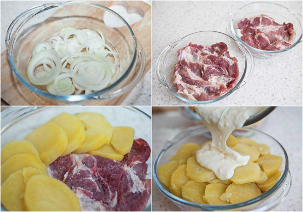 Formę, w której będziemy zapiekać mięso w piekarniku, należy wysmarować tłuszczem. Do tak przygotowanego naczynia wkładamy warstwami cebulę, mięso oraz plastry ziemniaków.