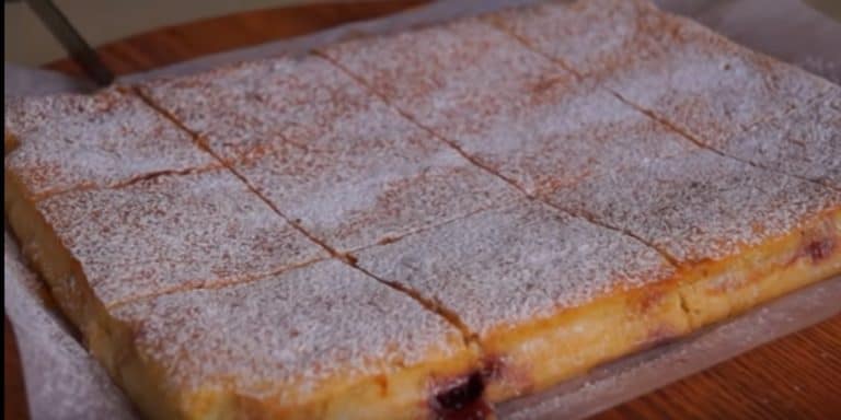 Ciasto pieczemy około 25-30 minut. Studzimy, oprószamy cukrem pudrem i kroimy na kawałki.