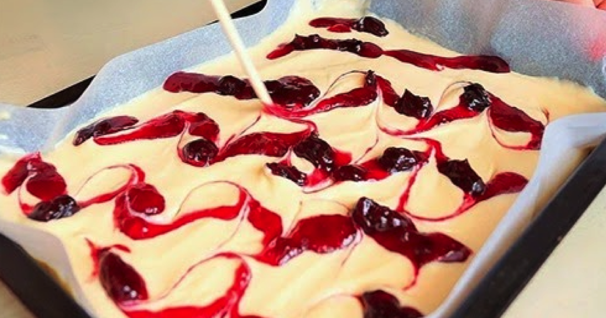 Do ciasta dodajemy dżem. Rozprowadzamy go patyczkiem lub szpikulcem po powierzchni.
