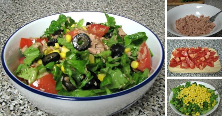 Liście sałaty należy opłukać pod bieżącą wodą. Osuszyć je ręcznikiem lub durszlakiem. Tuńczyka przełożyć do miski i odsączyć ewentualny płyn. Po umyciu pomidorów, posiekać je. Połączyć wszystkie składniki. Można dodać kilka kropel oliwy z oliwek. Taką sałatkę można jeść od razu po przygotowaniu.