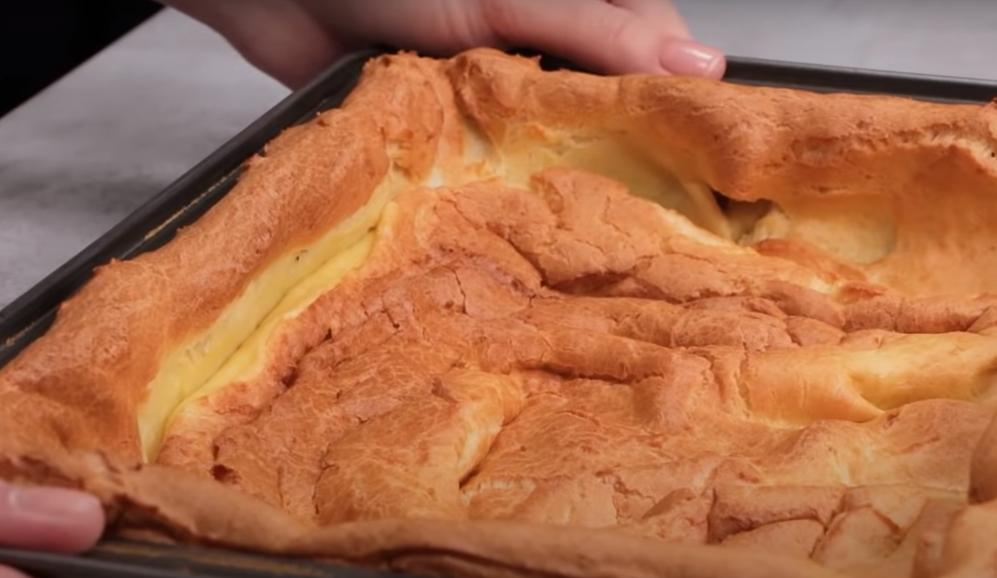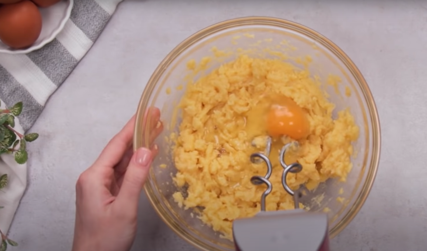 Przełóż ugotowane ciasto do miski i dodaj jajka. Wyłóż blachę papierem do pieczenia i ułóż na nią ciasto. Piecz w nagrzanym do 180 stopni piekarniku przez około 30 minut.