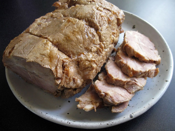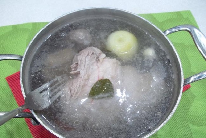 Mięso zanurzyć w gorącej wodzie. Dodać ziarna pieprzu, liście laurowe, cebulę i goździki. Gotować na średnim ogniu przez pół godziny. Następnie osolić i gotować jeszcze przez ok. 10 minut.