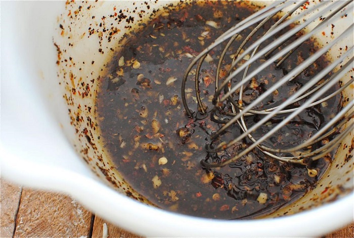 Sprawdzić gotowość mięsa. Wykonać drobne nacięcie. Jeśli sok, który wypłynie, jest przezroczysty – mięso jest gotowe. Jeśli sok jest czerwony, gotować dalej. Wymieszać 50 ml wody z sokiem z cytryny lub limonki, olejem i octem balsamicznym. Dodać przyprawy, pieprz i sól. Cebulę pokroić w cienkie pierścienie.