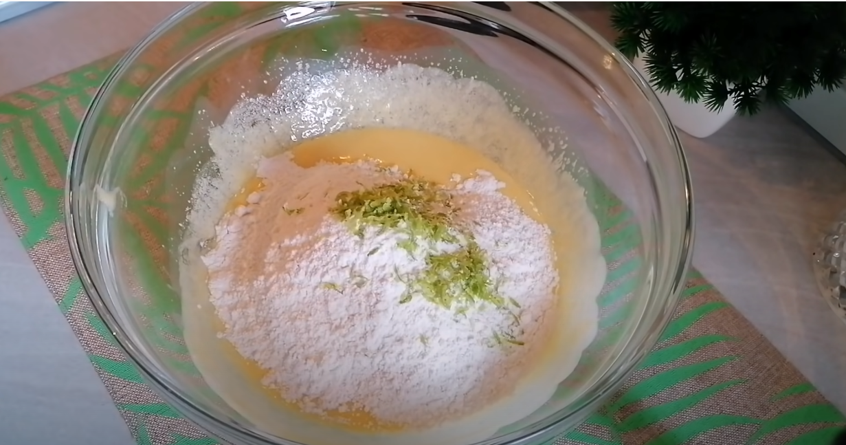 Dodaj mąkę, proszek do pieczenia, skórkę z cytryny lub limonki i sól. Połącz wszystkie składniki, aż uzyskasz gładką masę.