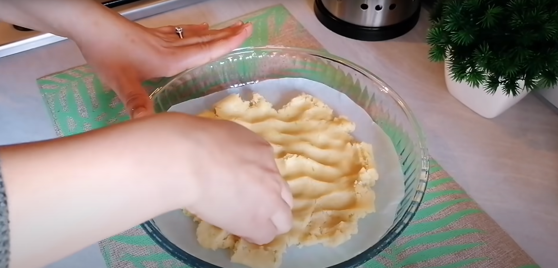 Wyjmij ciasto z lodówki i przygotuj formę. Połóż dolną połowę ciasta.