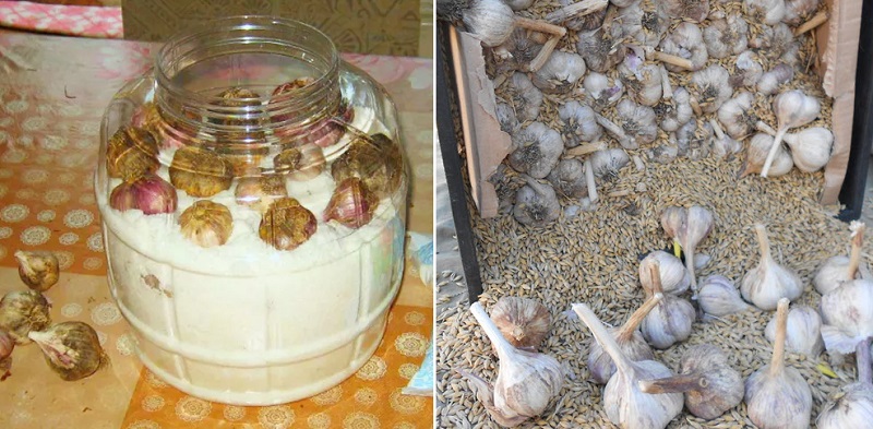 Inną metodą jest zasypanie główek czosnku zbożem, popiołem, mąką lub trocinami. Ochroni go to przed wilgocią i pojawieniem się pleśni. Należy pamiętać, że w słoju, pudełku lub beczce górna warstwa produktu, którym zasypujemy czosnek, powinna mieć co najmniej 2 cm grubości.