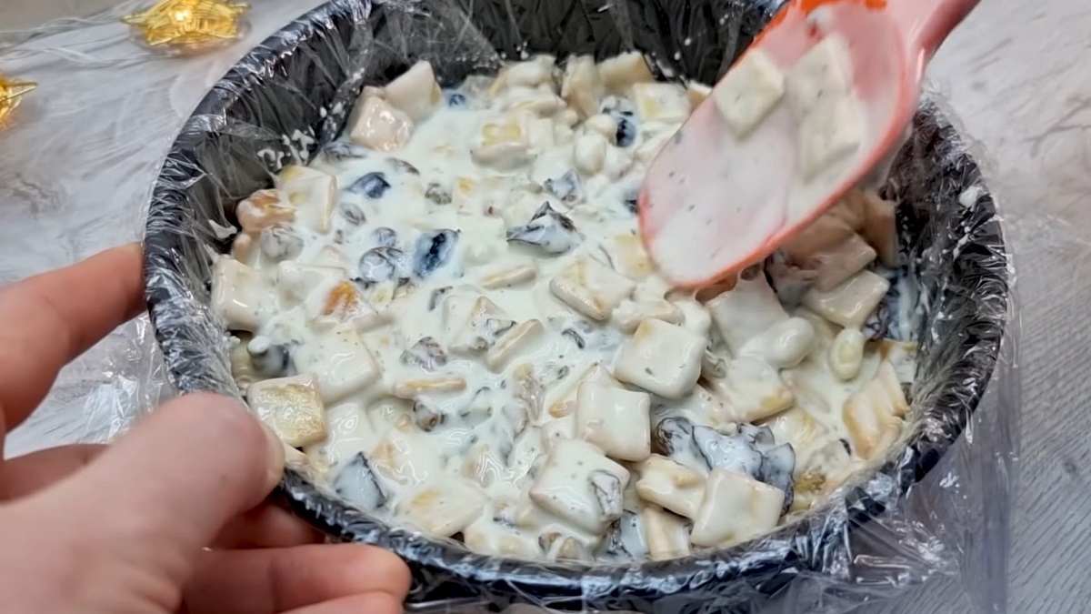 Za pomocą łyżki delikatnie wymieszaj składniki ze sobą. Dużą miskę przykryj folią clingową, a następnie przelej do niej ciasto. Brzegi powinny być równe.