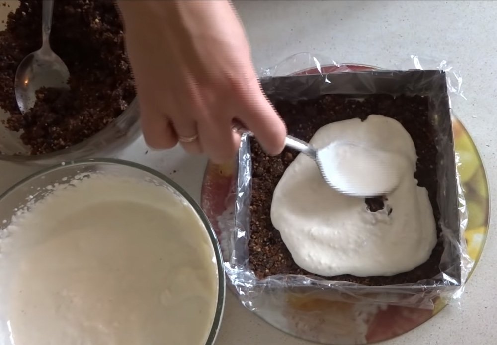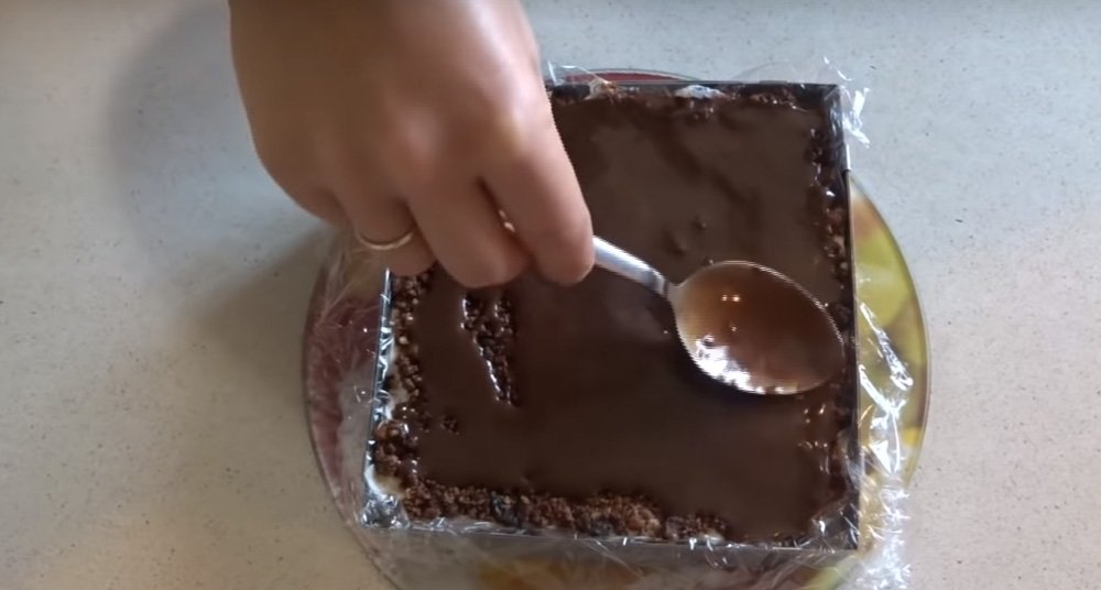 Na formę nałożyć folię spożywczą, potem nakładać ciasto warstwami – najpierw powinna być warstwa czekoladowa, potem śmietana itd., a na końcu ułożyć warstwę herbatników. Teraz wystarczy na górę położyć spożywczą folię i zostawić na całą noc w lodówce.