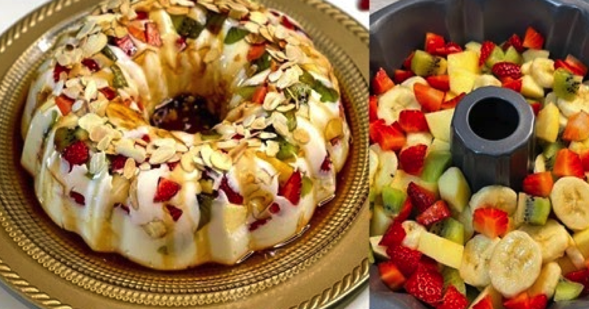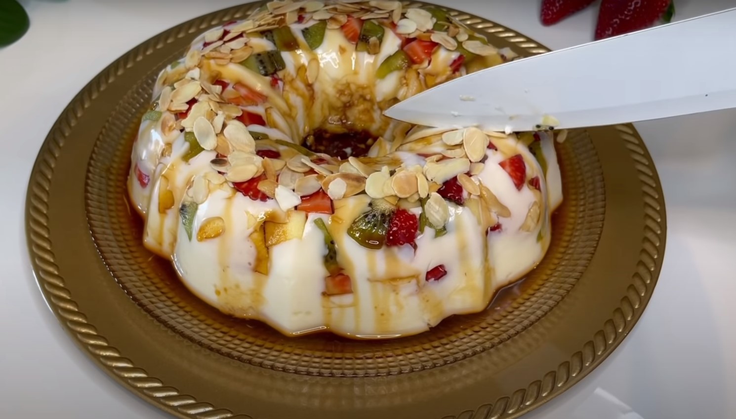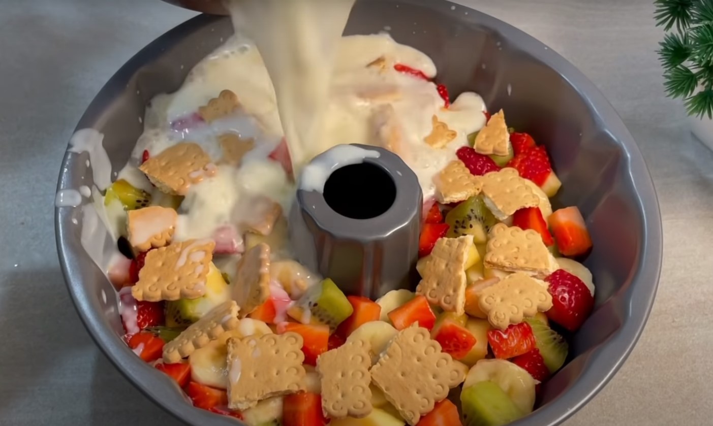 Kawałki owoców wsyp do formy na babkę. Na wierzchu ułóż połamane ciasteczka. Polej całość przestudzonym budyniem. Przykryj formę folią spożywczą i włóż do lodówki na godzinę lub dwie, aż budyń się zestali.