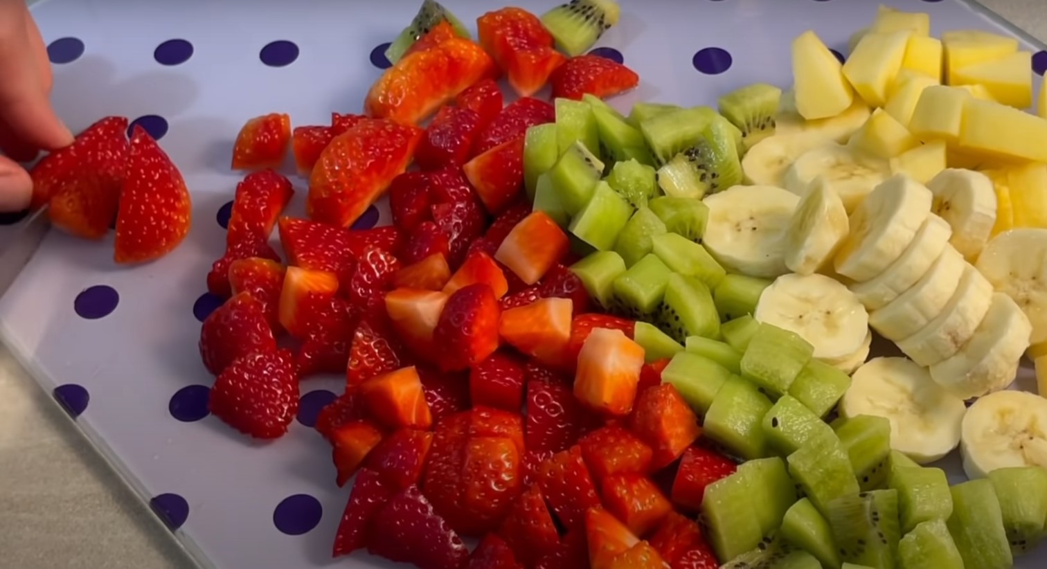 Owoce umyj. Obierz te, które mają skórkę. Wszystkie drobno pokrój i skrop sokiem z cytryny, aby nie ciemniały.