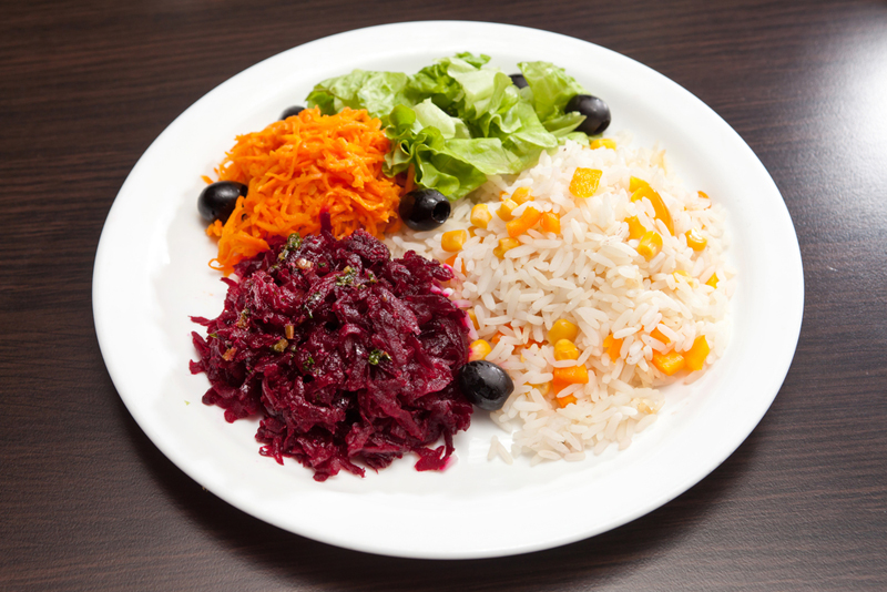 Buraki i marchewkę zetrzyj na tarce. Ryż wymieszaj z kukurydzą. Umieść obok siebie na talerzu warzywa, oliwki w całości oraz ryż. W miseczce wymieszaj ocet, olej i sos sojowy. Wszystkie składniki wymieszaj dopiero tuż przed podaniem.