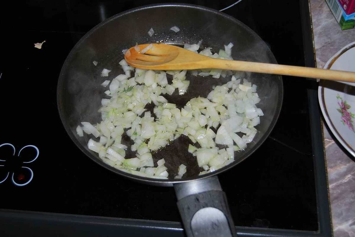 W międzyczasie możesz zabrać się za wykonanie farszu. Cebulę obierz i posiekaj w drobną lub nieco większą kostkę. Podsmaż na maśle do miękkości.