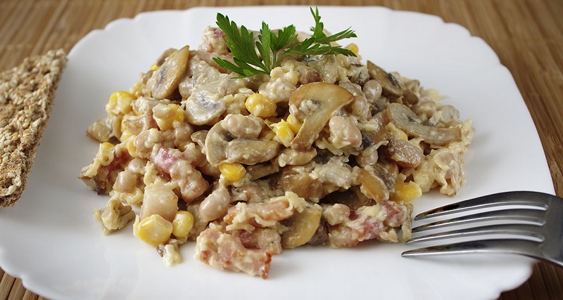 Grzyby pokrój w plastry, a szynkę w paski. Szynkę i pieczarki usmaż oddzielnie.Czosnek wyciśnij przez praskę, Ser zetrzyj na drobnej tarce. Usmażoną szynkę i pieczarki. Usmażoną szynkę i pieczarki wymieszaj z fasolą, kukurydzą. czosnkiem i serem. Dodaj musztardę i majonez oraz przyprawy do smaku.