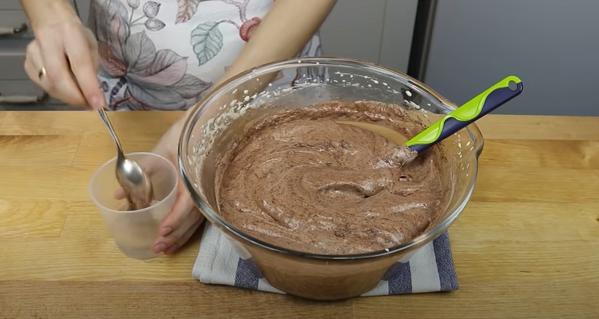 Osobno wymieszaj mąkę z proszkiem do pieczenia i kakao. Nastąpienie przesiej powstałam mieszankę przez sitko i dodaj małymi etapami do miski z ubitym mi białkami. Całość lekko wymieszaj całość od dołu do góry.