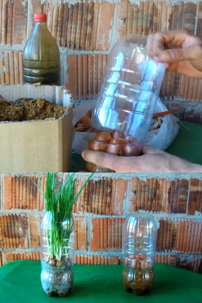 Dno butelki wyłóż papierem toaletowym, szmatami, trocinami lub czymś innym, co posiadasz a co pomoże Ci utrzymać wilgoć przez długi czas. Wybierz 5 – 7 cebul, wielkości mniej więcej kurzego jaja. Odetnij czubek każdej cebuli, aby widoczny był jej środek. Ułóż cebulki na wyściółce.