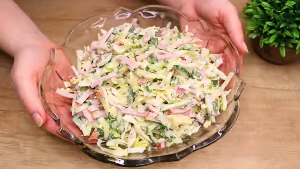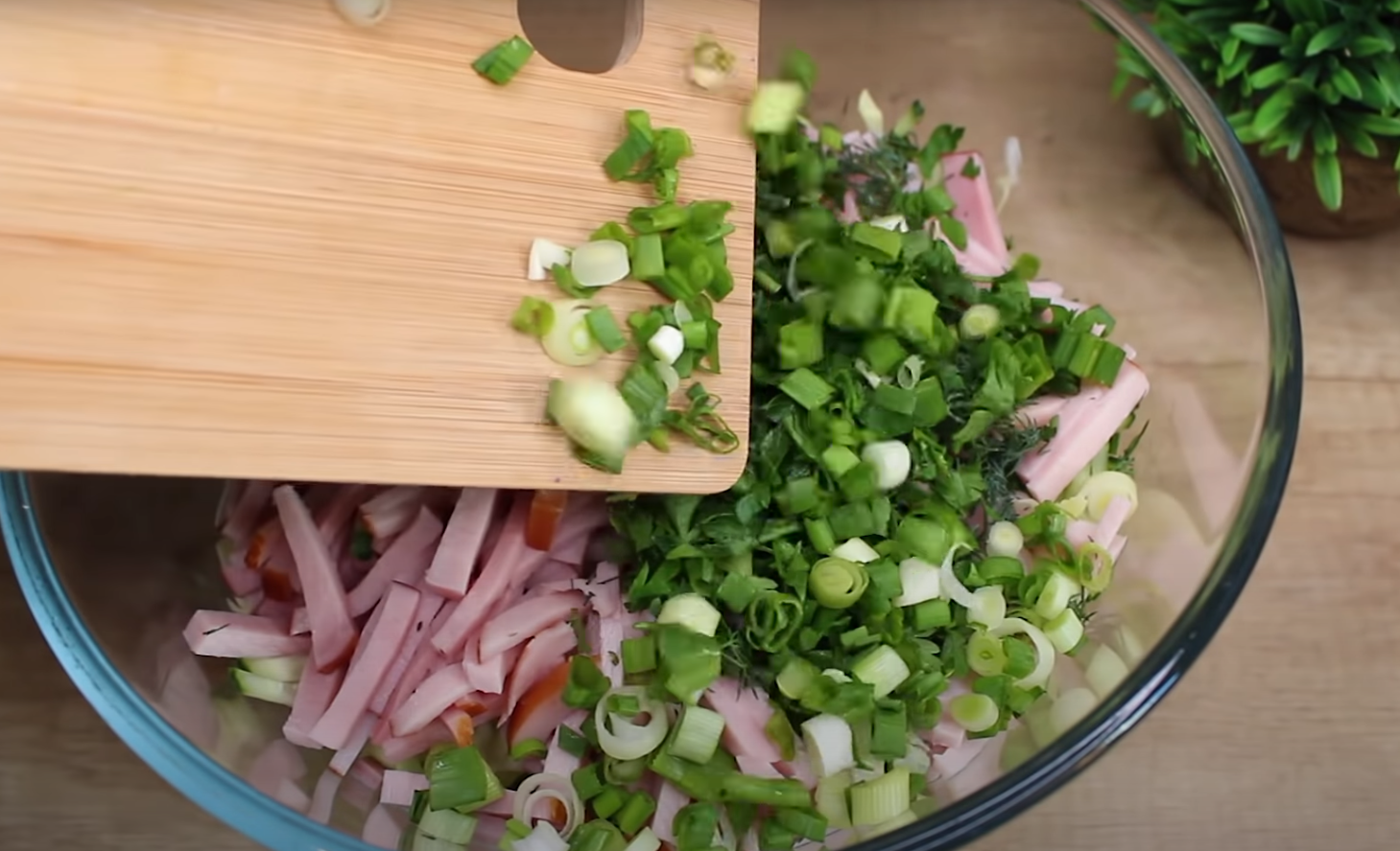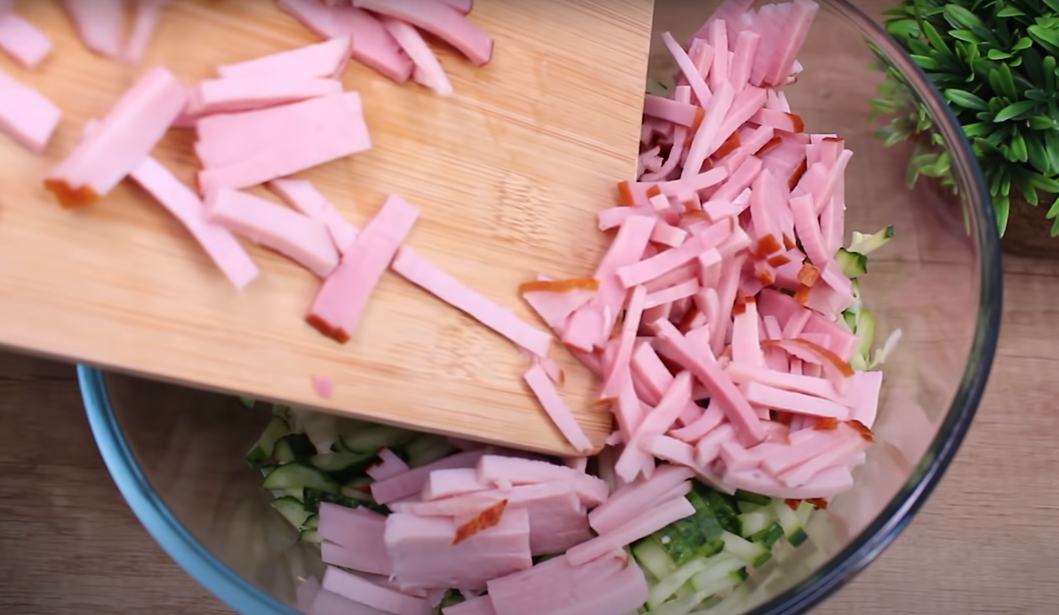 Kapustę szatkujemy dosyć drobno, następnie kroimy w paski szynkę i ogórki.