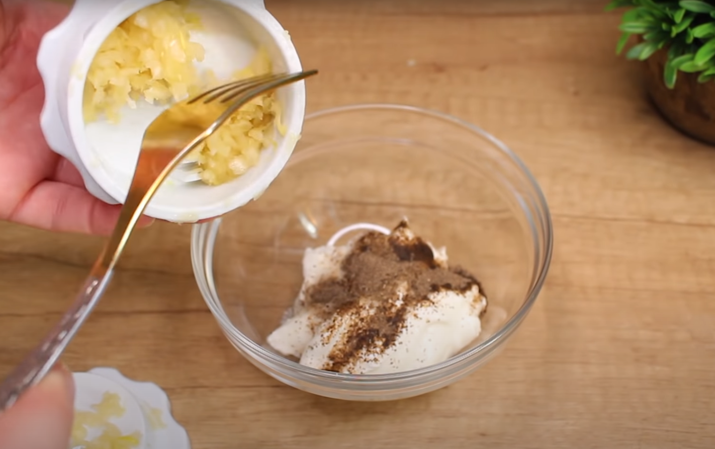 Do osobnego naczynia przekładamy śmietanę lub jogurt, doprawiamy szczyptą soli, pieprzem oraz przeciśniętym przez praskę (lub bardzo drobno pokrojonym) czosnkiem.