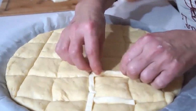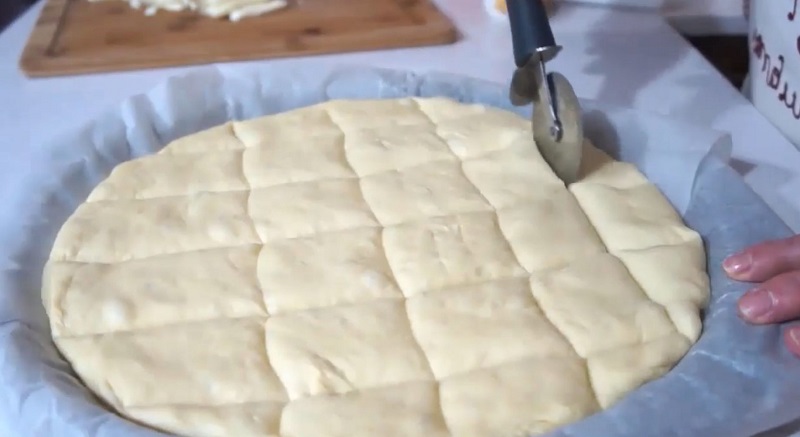 Mozzarellę pokroić w cienkie paski. Przygotować okrągłą formę do pieczenia i wyłożyć ją pergaminem, bądź papierem do pieczenia. Rozłożyć równo masę. Za pomocą noża wykonać nacięcia na powierzchni ciasta (jak na poniższym obrazku).