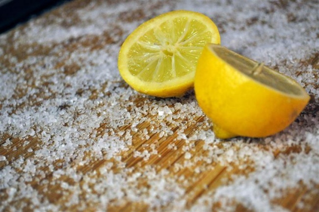 Na pewno dobrze wiesz jak trudno pozbyć się zapachu z drewnianej deski do krojenia. Mamy na to sposób. Posyp deskę obficie solą morską. Teraz przetnij cytrynę na połowę.